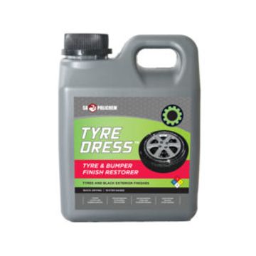 Tyre & Bumper Finish Restorer. A medium duty acrylic coating used for applying to vehicle tyres. Tyre Dress is low shine product, which restores tyres and exterior black finishing to an original black colour. Tyre Dress has excellent wear resistance and is very easy to apply. Tyre Dress can be applied to all plastic black finishes on the vehicle; cars, buses, trucks, forklifts or other industrial machinery. Tyre Dress is a quick drying product which reduces the adherence of dust.